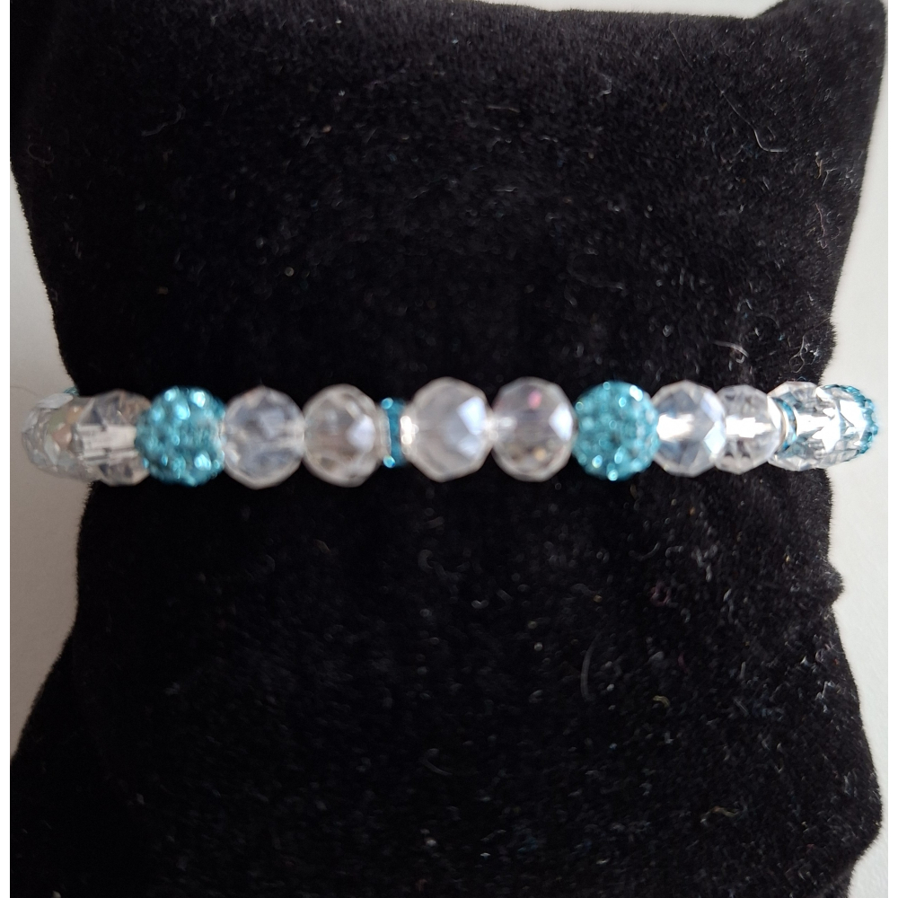 Armband met transparante glaskralen gecombineerd met turquoise shamballa kralen.