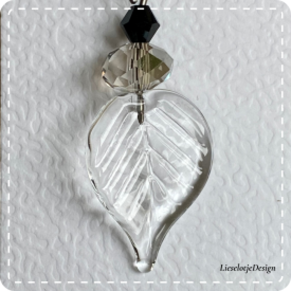 Handgemaakte heldere blad oorbel van glas in combinatie met grijs en zwart glaskristal.