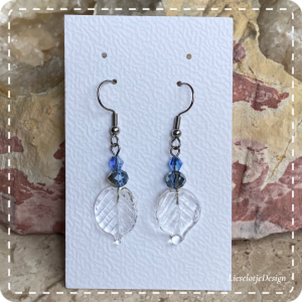 Handgemaakte helder glazen blad oorbel van glas in combinatie met jeanskeurig glaskristal.