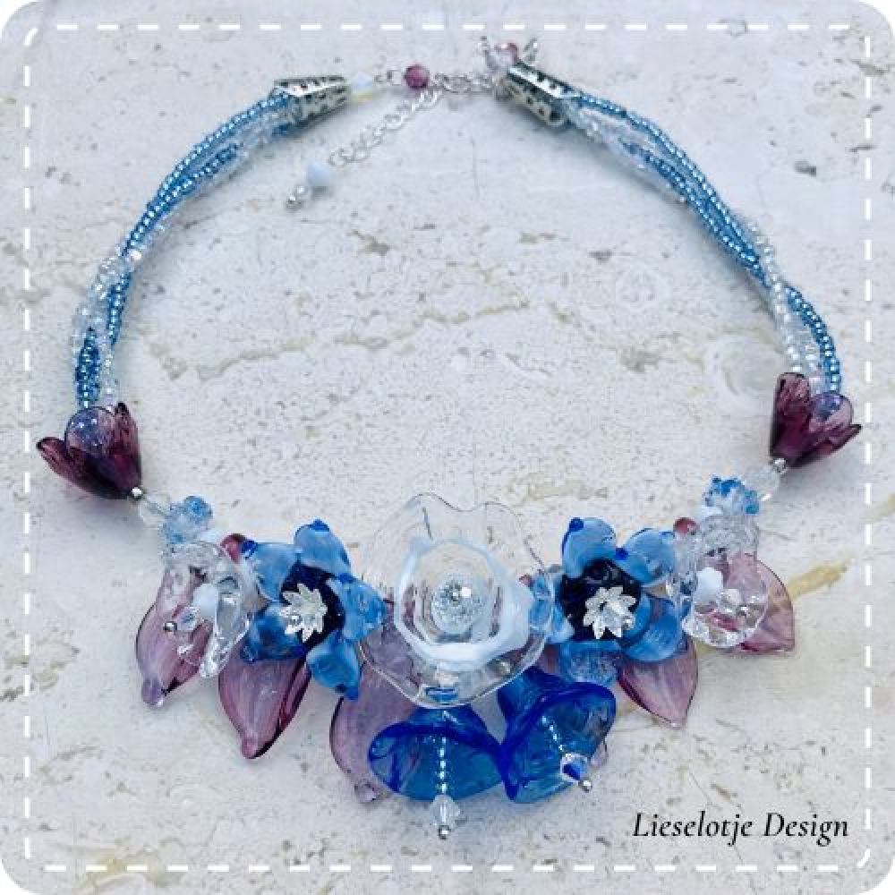 Handgemaakte blauw paarse bloemketting. Ketting gevormd uit een cluster van blauwe en helder glazen bloemen afgewisseld met paars glazen bladeren.