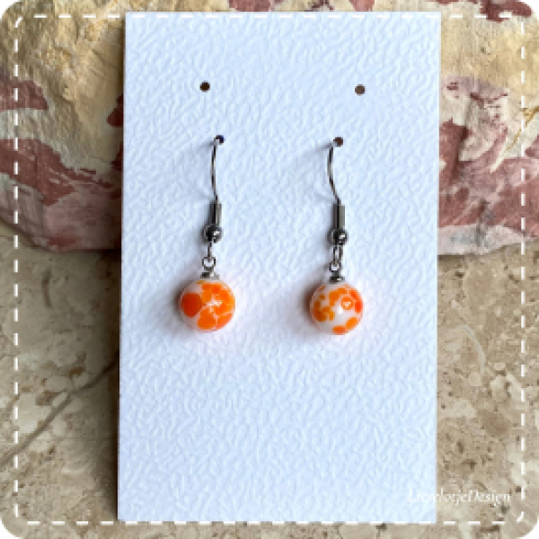 Handgemaakte confetti-bol oorbel van glas met oranje kleuren.