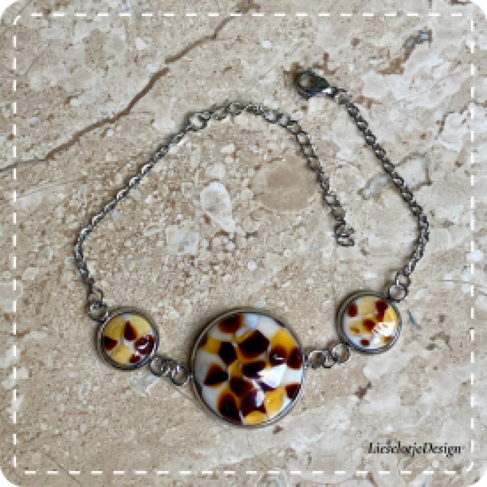 Handgemaakte lampwork cabochon sieradenset in bruin tinten. De set bestaat uit een ketting met een hanger van een grote cabochon van 25 mm en een armband met 3 cabochons van achtereenvolgens 10-20-10mm en 2 balvormige oorbelletjes met een doorsnee van ongeveer 1 cm.