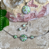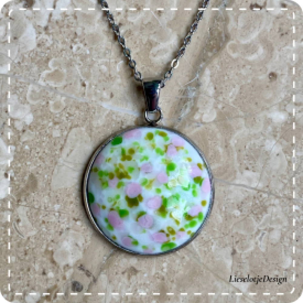 Handgemaakte lampwork cabochon sieradenset in roze/groene tinten. De set bestaat uit een ketting met een hanger van een grote cabochon van 25 mm en een armband met 3 cabochons van achtereenvolgens 10-20-10mm en 2 bolvormige oorbelletjes met een doorsnee van ongeveer 1 cm.