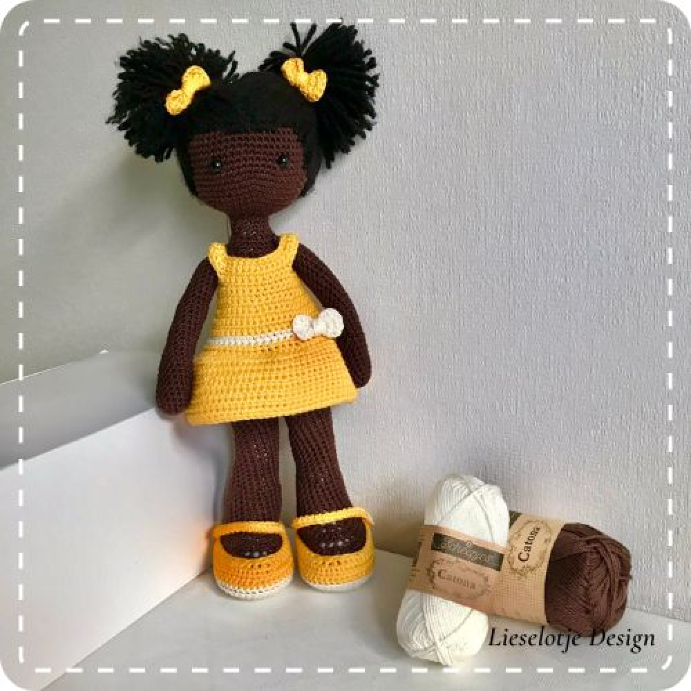 De afmetingen van de pop ligt mede aan hoe strak gehaakt wordt maar zijn ongeveer: 30-35 cm