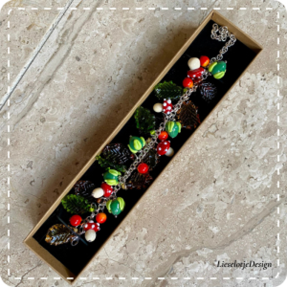 Handgemaakte herfstarmband armband. De armband bestaat uit een stainles steel basis armband. Deze is rijk gevuld met diverse glazen bessen, bloemknoppen, paddestoeltjes en glazen blaadjes die als bedels aan de armband hangen.