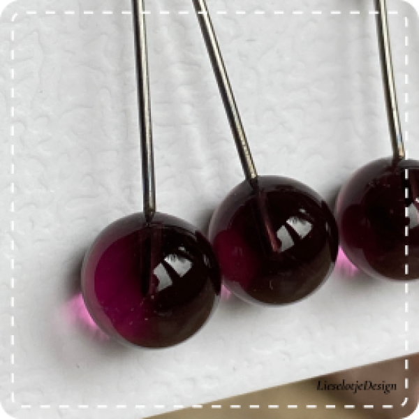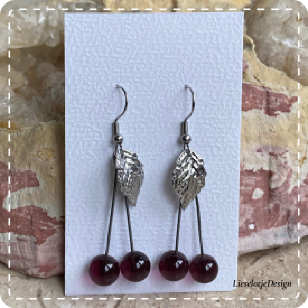 Handgemaakte paars/rode kersoorbel van glas met een stainless steel zilverkleurig blad.