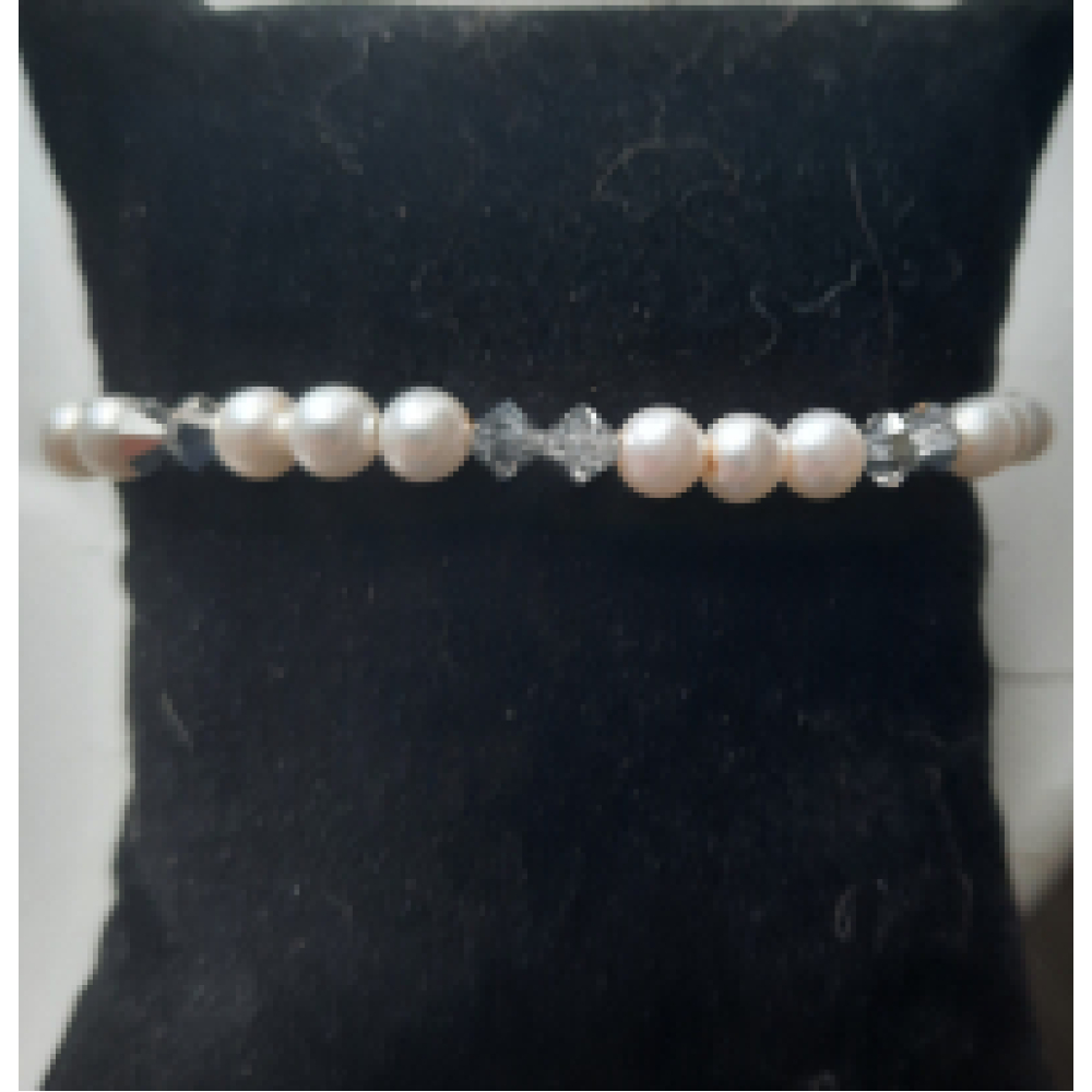 De armband heeft steeds 3 witte parrls afgewissled met doorzichtige bicones