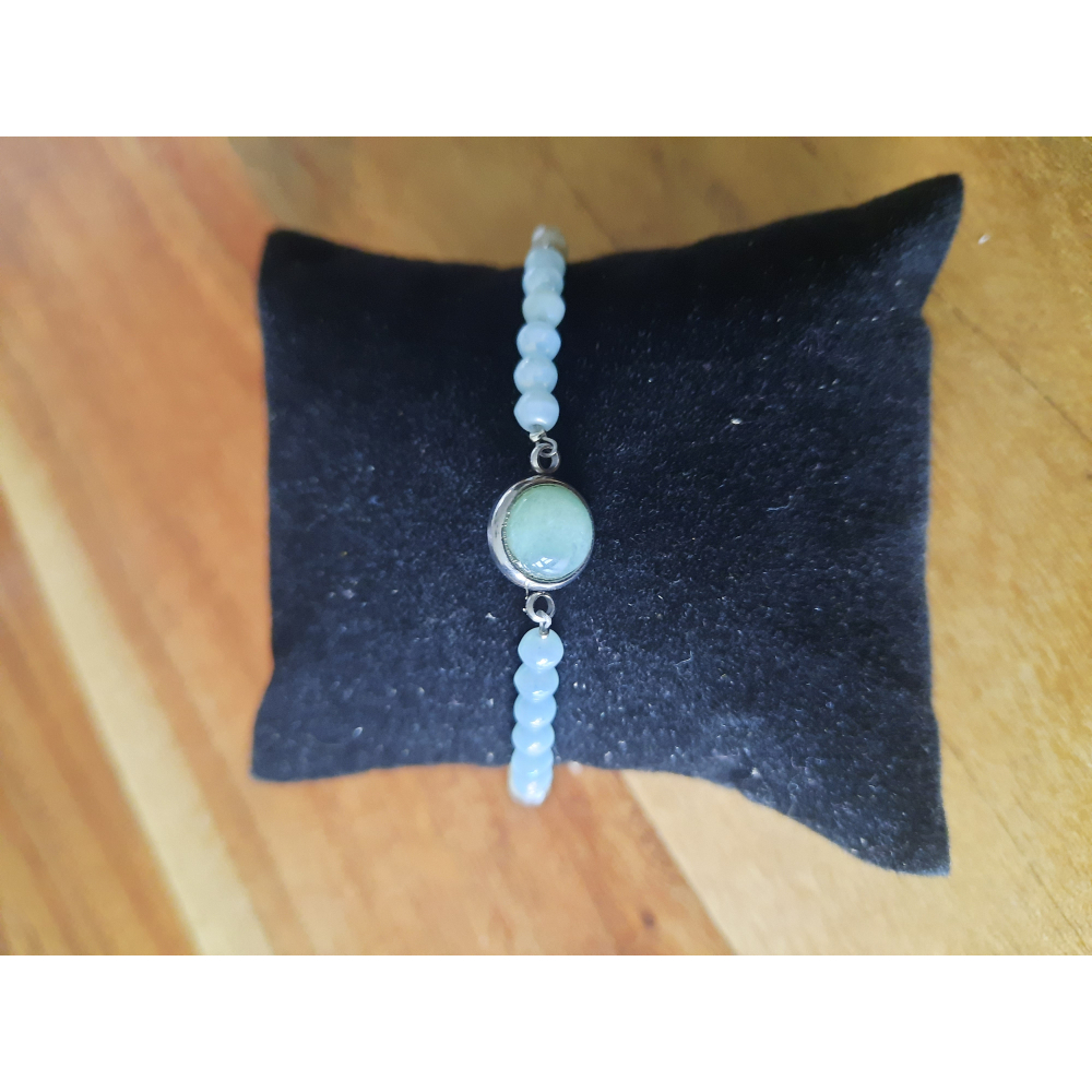 Een mooie armband in mintkleur en wit met een cabochon in groen Gemaakt van glaskralen met parelmoer look