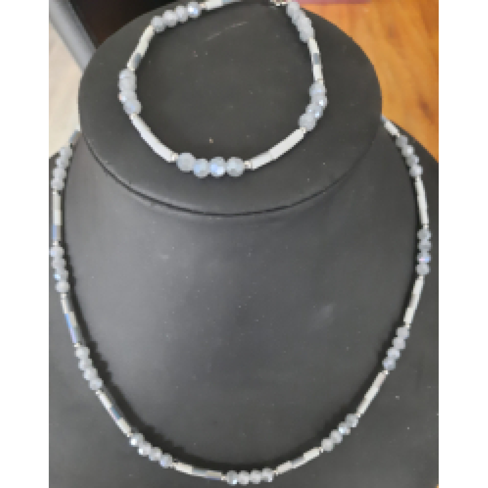 Deze set bestaat uit een ketting en armband, gemaakt van facet- en glaskralen in mooie blauwe en grijze tinten.