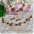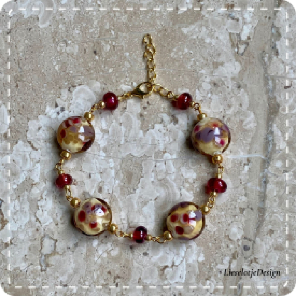 Handgemaakte lampwork lentil sieradenset in fuchsi/paars/creme tinten. De set bestaat uit een ketting met twee lentil kralen van ongeveer 15 mm, een armband met 4 lentil kralen van ongeveer 15mm omringt door fuchsia lampwork spacer kralen. Daarnaast 2 bolvormige oorbelletjes met een doorsnee van ongeveer 1 cm met daarboven een fuchsia spacerkraal.