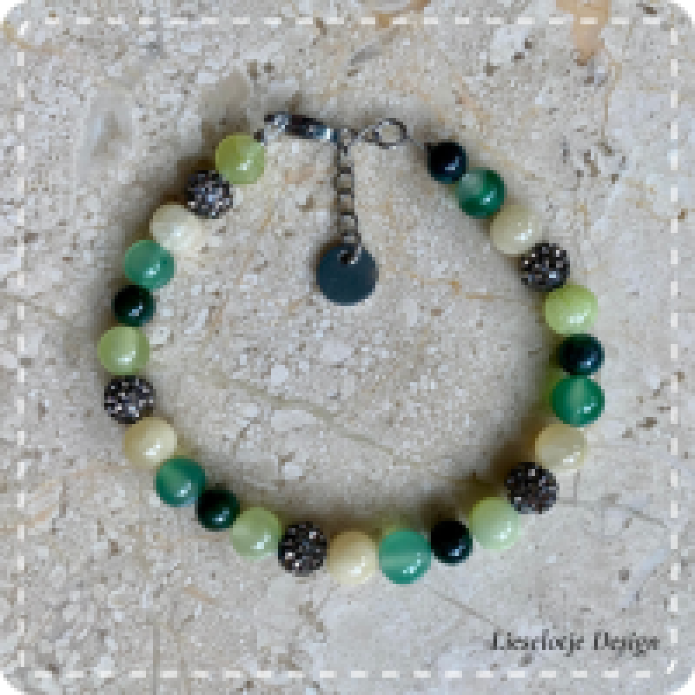 Handgemaakte natuursteenarmbanden. Met diverse groen en mintgroene natuursteenkralen afgewisseld met Shamballa kralen.