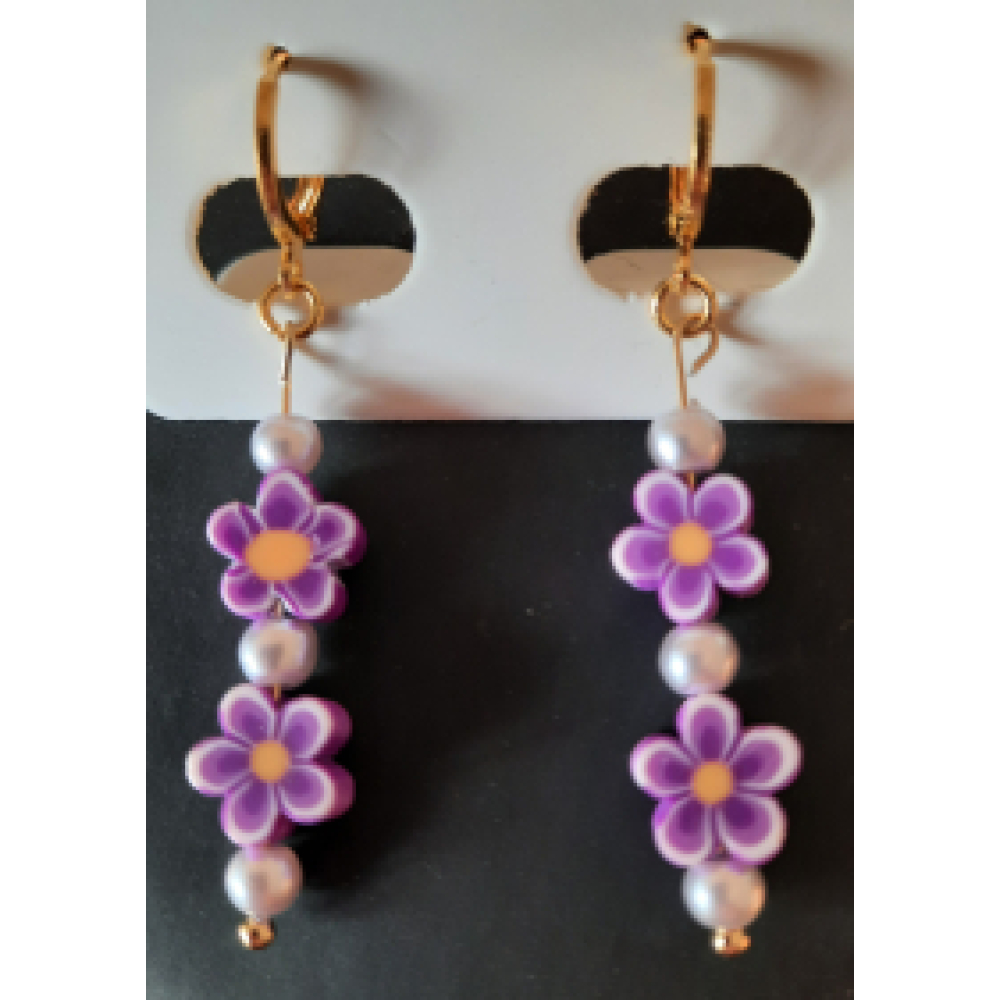 Zelfgemaakte Oorbel met een 2 paarse polymeerkralen in de vorm van een bloem