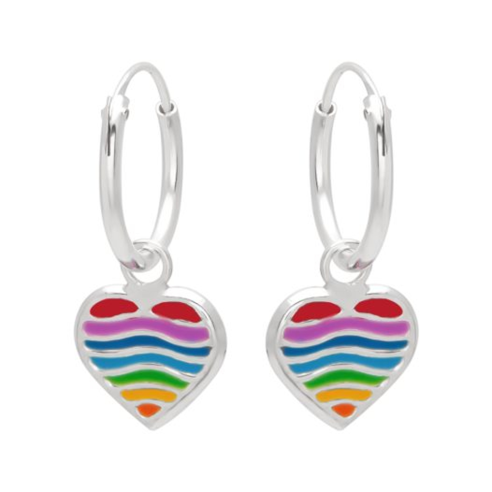 Deze zilveren oorringen met hanger zijn speels en kleurrijk ontworpen als een hart in regenboogkleuren. Het hart is levendig uitgevoerd, waardoor de verschillende kleuren mooi opvallen en een vrolijke uitstraling geven. Het ontwerp combineert elegantie met een jeugdige en creatieve flair, waardoor het zowel opvallend als stijlvol is.