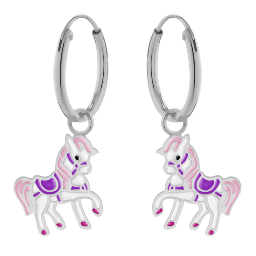 Deze zilveren oorringen met hanger zijn een droom voor kleine paardenliefhebbers. Aan de ring hangt een schattig paard met glanzende roze manen en staart en een paars zadel, wat de oorbellen een vrolijke en kleurrijke uitstraling geeft. Het speelse design maakt ze perfect voor kinderen die gek zijn op paarden en alles wat daarmee te maken heeft.