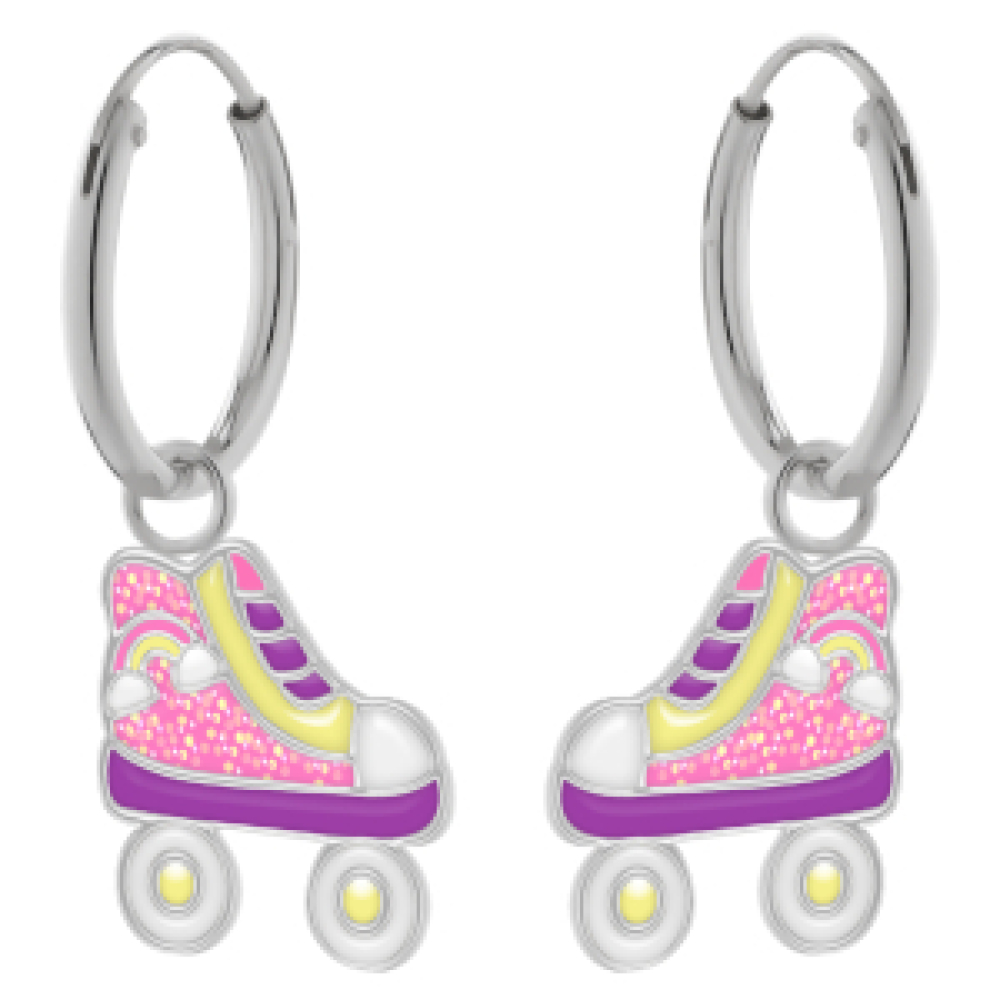 Deze zilveren oorringen met hanger zijn een vrolijke en speelse keuze voor kinderen die van beweging en kleur houden. Aan de ring hangt een rolschaats in zachte pastelkleuren, versierd met glitter en een regenboog, wat de oorbellen een sprankelend en fantasierijk accent geeft. Het unieke en vrolijke design maakt ze perfect voor kinderen die graag opvallen met kleurrijke en creatieve sieraden.