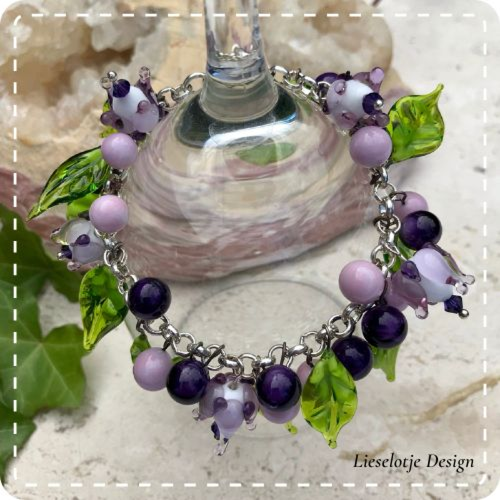 Handgemaakte prachtige natuurlijke paarse bessen armband. De armband bestaat uit een stainles steel basis armband. Deze is rijk gevuld met diverse glazen bessen, bloemknoppen en glazen blaadjes die als bedels aan de armband hangen.