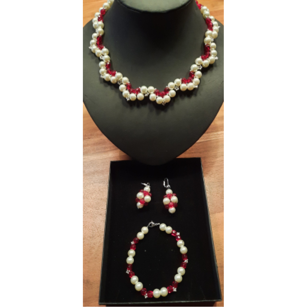 Dit mooie setje bestaat uit een ketting, armband en oorbellen. De ketting en armband zijn gemaakt van witte glasparels en rode rondells, afgewisseld met zilveren Miyuki kralen. De oorbellen zijn voorzien van een 925 sterling zilveren oorhanger, maar bevatten geen Miyuki kralen.