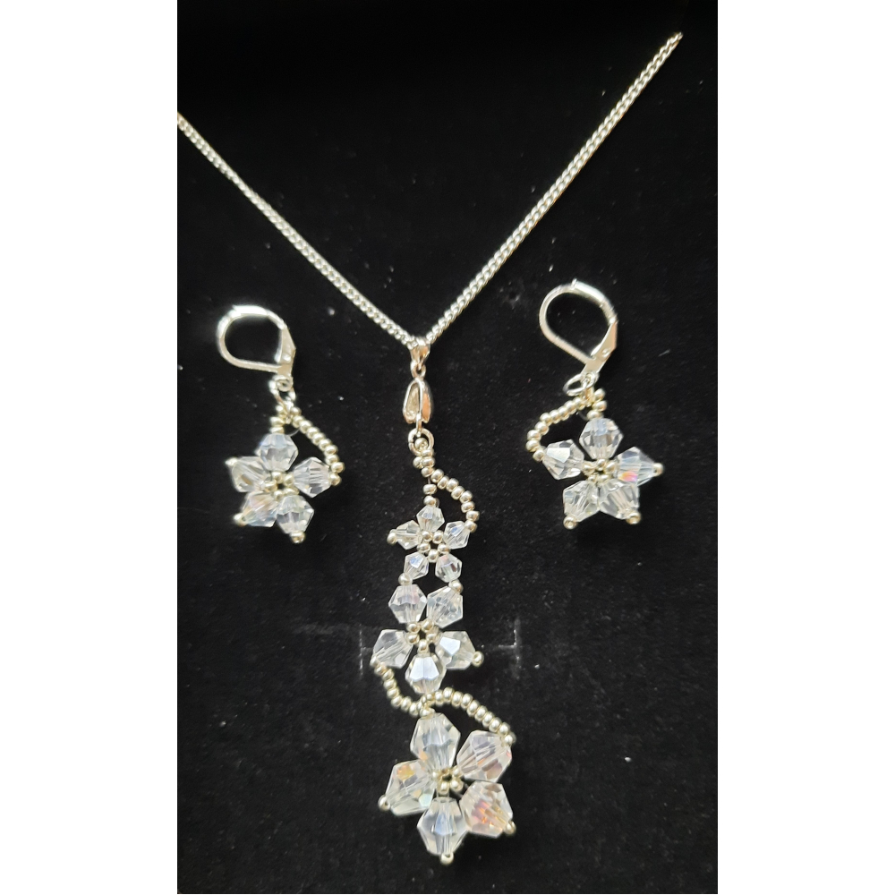 Dit prachtige zelfgemaakte setje bestaat uit een ketting en bijpassende oorbellen. De ketting waar de hanger aan hangt is gemaakt van 925 sterling zilver, net als de klem aan de hanger. Verder is het setje versierd met facet glas bicons en zilverkleurige Miyuki kralen, wat het geheel een elegante uitstraling geeft.