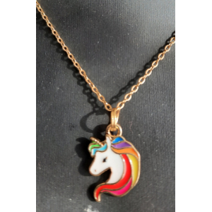 Kinderketting goudkleur met als hanger een eenhoorn in rood/geel/rose