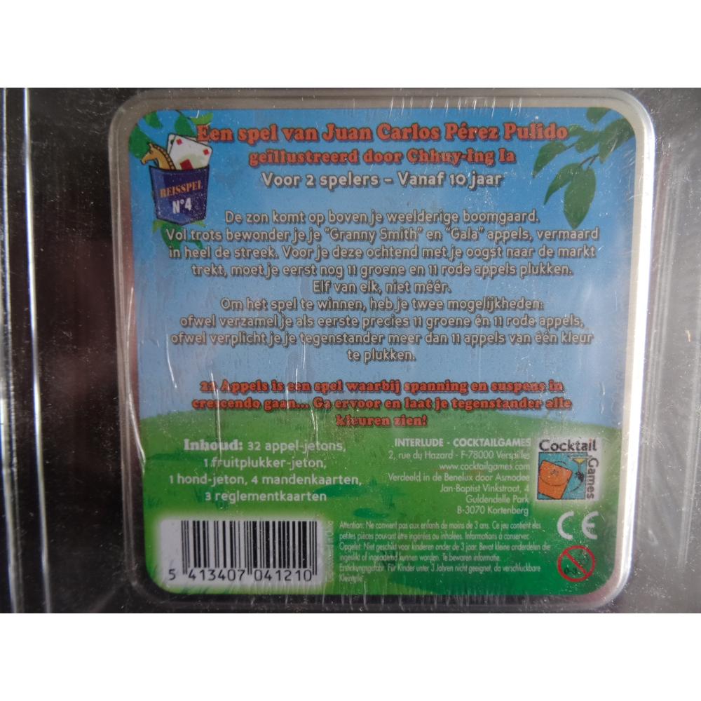Bij 22 appels komt de zon op boven je weelderige boomgaard. Vol trots bewonder je je Granny Smith en Gala appels, vermaard in de hele streek. Voor je deze ochtend met je oogst naar de markt trekt, moet je eerst nog 11 groene en 11 rode appels plukken. Elf van elk, niet meer. Om het spel te winnen, heb je 2 mogelijkheden: ofwel verzamel je als eerste precies 11 groene en 11 rode appels, ofwel verplicht je je tegenstander om er meer te plukken.