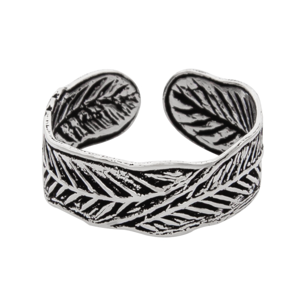 Deze zilveren teenring met geoxideerd bladpatroon straalt een natuurlijke en bohemian charme uit. Het verfijnde ontwerp met subtiel gegraveerde nerven symboliseert groei en verbinding met de natuur, terwijl de geoxideerde afwerking zorgt voor extra diepte en detail in het patroon.