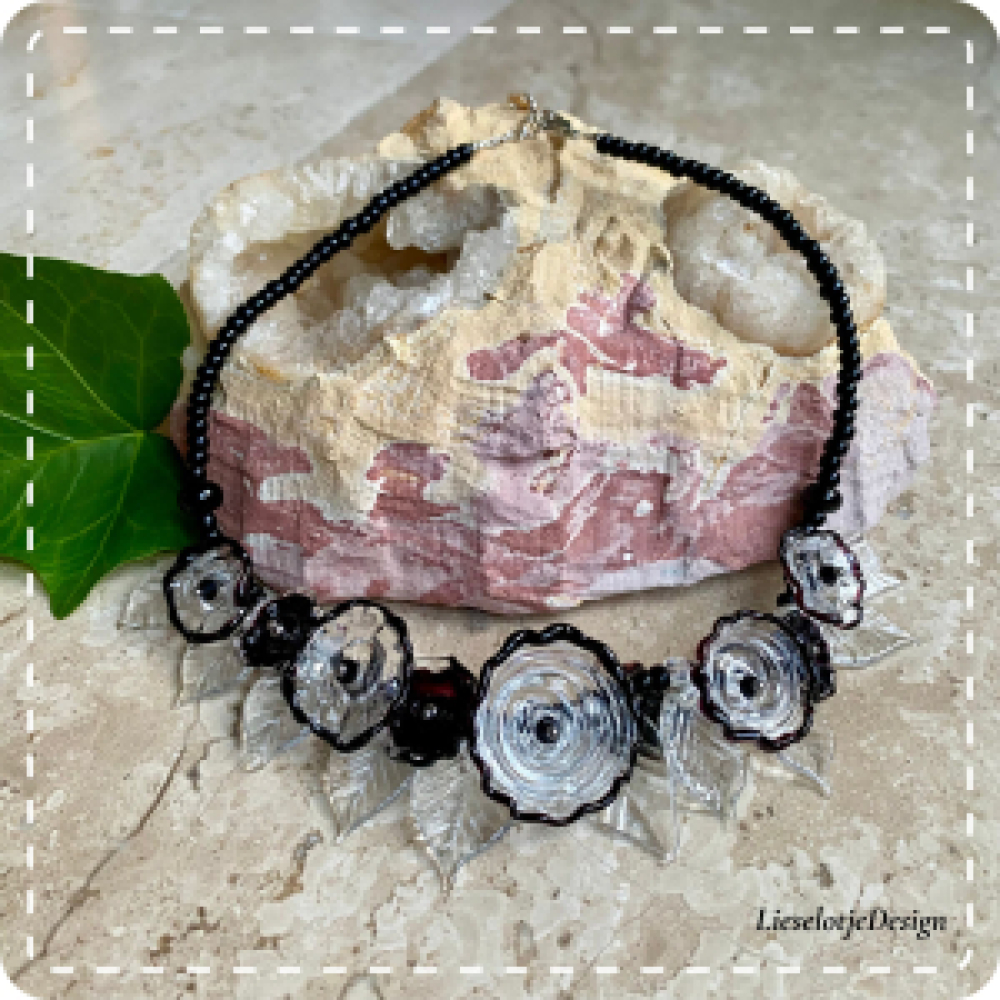 Handgemaakte zwart heldere bloemketting. Ketting bestaande uit verschillende zwart, zwart/heldere bloemen afgewisseld met helder glazen bladeren.